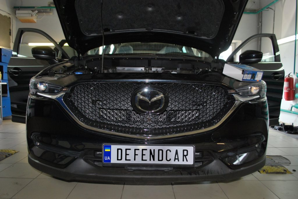 Защита Mazda Cx-5 построена на базе автосигнализации Pandora. Установлена система 1800L. Выполнена авторская установка с проводными и беспроводными блокировками. Реализован бесключевой автозапуск двигателя, заблокирован разъем диагностики, установлены модельные замки капота и АКПП, а так же выполнена блокировка бесключевого доступа.